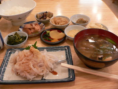 イカ刺し定食の味噌汁を「ごっこ汁」に替えてもらって200円増しの1,300円でした。ご覧のようにイカ刺しが細くて、甘みが出ておいしかったです。ここのイカソーメンを食べると他のがイカうどんに見えるというのが店主さんの口癖らしく、他のお客さんにそう言っているのが聞こえました。