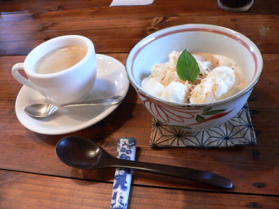 デザートは、白玉団子とココナッツミルクの冷菓。和風の器がいけてます。
