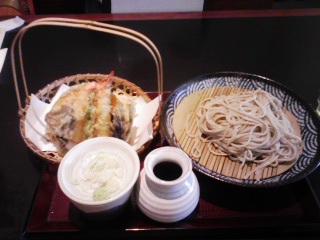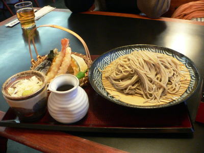 みつねさんはお気に入りの「上たぬきそば(といっても、天ぷらそばほどではないにしても、かき揚げ、茄子天、南京天が載っている)」を冷やしで注文。自分は、天せいろに日本酒、浦霞を少々(苦笑)。
