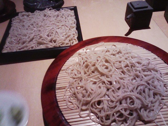 手前が私の頼んだ二八、奥がみつねさんの頼んだ田舎、それぞれ一枚目です。この後、自分は田舎、みつねさんは辛味大根おろしそばを注文しました(苦笑)。
