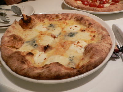 写真は、みつねさんが注文したクワトロフォルマッジョ(4種のチーズ)のピザです。私も大好きなので、一切れ分けてもらいました。ピザはその場でドウから作って釜で焼き上げているので、特においしいです。