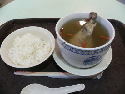 野菜不足だったので、パクチー(香菜)をたっぷりかけさせてもらいました。チキンライスについていた赤いラー油のようなものをちょっと舐めてみたのですが、豚足のタレのような味でした……でも、一箸だけで、むちゃ辛かったです。スープをレンゲに取って、一箸だけ溶かして、はふはふしながら飲みました(汗)。