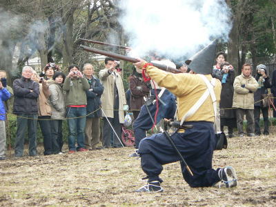 板橋区の高島平で活動されている、高島流西洋砲術の保存会の方々が空砲射撃の実演(もちろん空砲)をされたのですが、残念ながら銃はゲベールでもミニエーでも、ましてやスペンサーでもなく、火縄銃でした。保存会の方々のこだわりもあるようですが、西洋流砲術であればゲベール銃であって欲しかったなぁと、ちょっと残念でした。