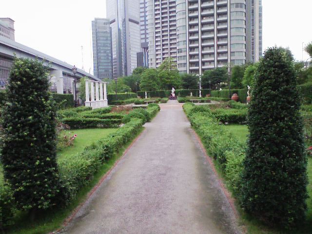 江戸東京重ね地図で現在の浜松町一丁目と狙いを定め、今日汐留に行く用事のついでに訪ねてみました。浜離宮の南端側と高速道路を挟んで斜向かいの辺り、というと、港区イタリア公園の辺りでしょうか。