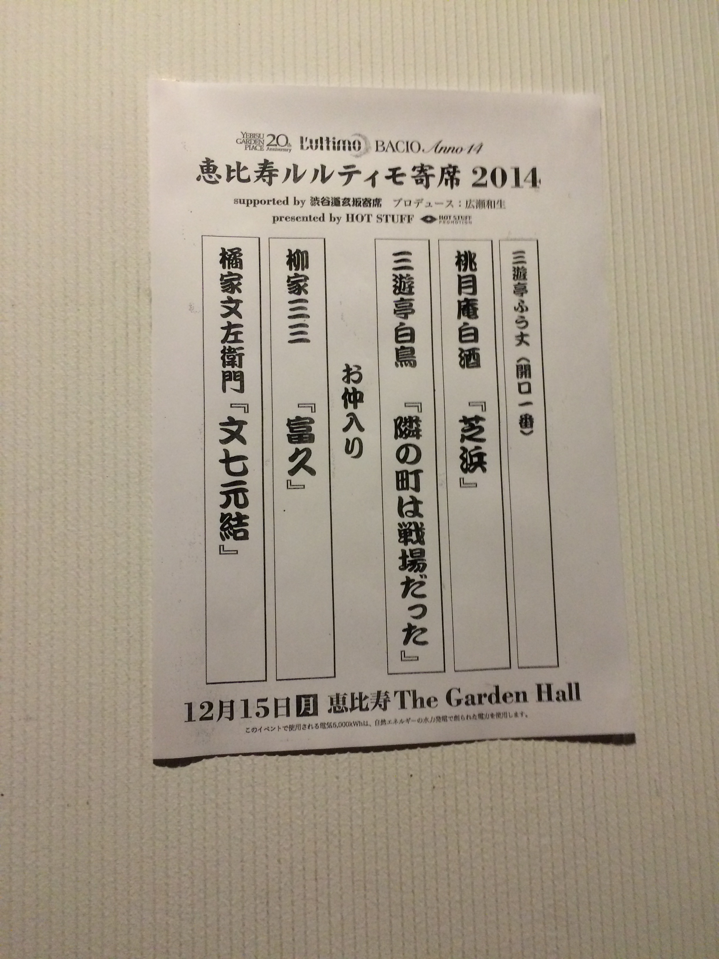 でも何よりのお得感は、長講四席。白酒師匠の「芝浜」こそ軽めだったけど、冬のトリネタのオンパレード。7時開演で、10時半閉演ですよ。こじゃれたパイプ椅子だったので腰痛くなりましたよ。でも師走らしいがっつりした長講に大満足でしたよ。