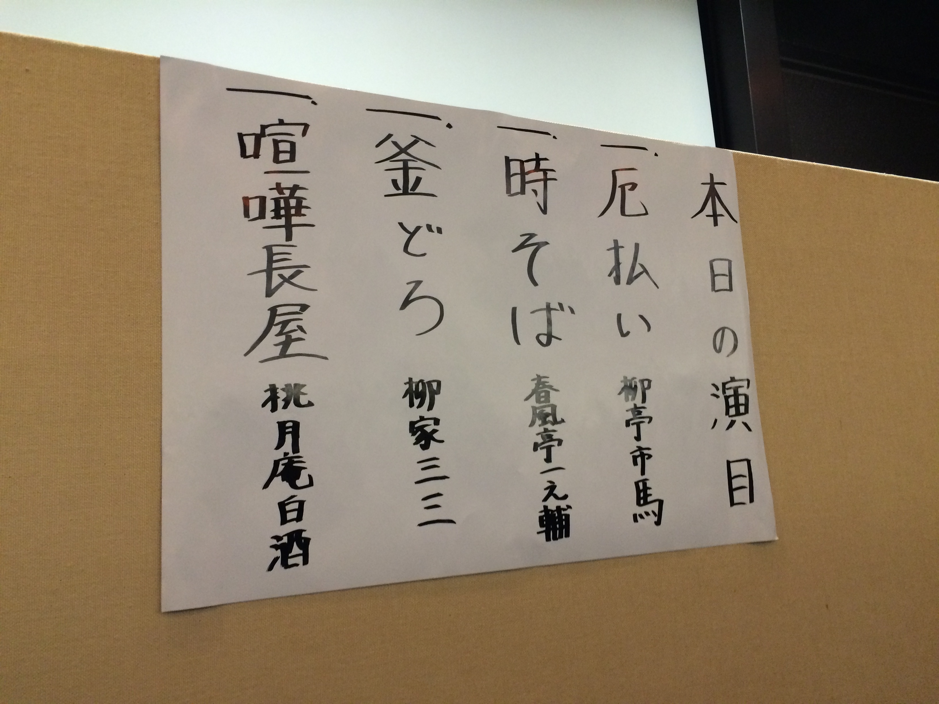 やや押し気味で、二八そばのネタふって時そば。あまりマクラでどっかんどっかんやり過ぎて、ちょっと時間押していたかも知れません。