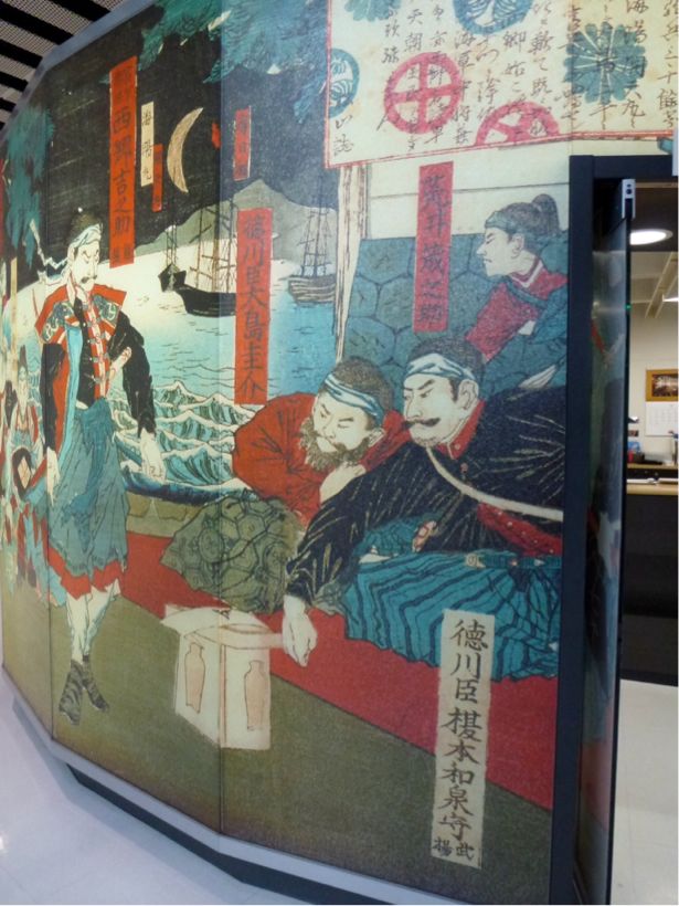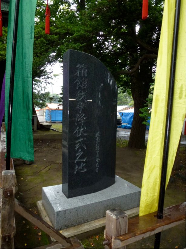 五稜郭タワーの入り口に昔の錦絵を拡大して貼っているのは知っていたのですが、表側が箱館戦争決戦図で裏側が降服図だってこと、今さらのように知りました。降服図は榎本さんと大鳥さんが西郷隆盛さんに降服している図柄です……史実の描写ではないですが、箱館戦争当時の旧幕府軍幹部で誰が特に戦犯級と見られていたのか、参考になります。
