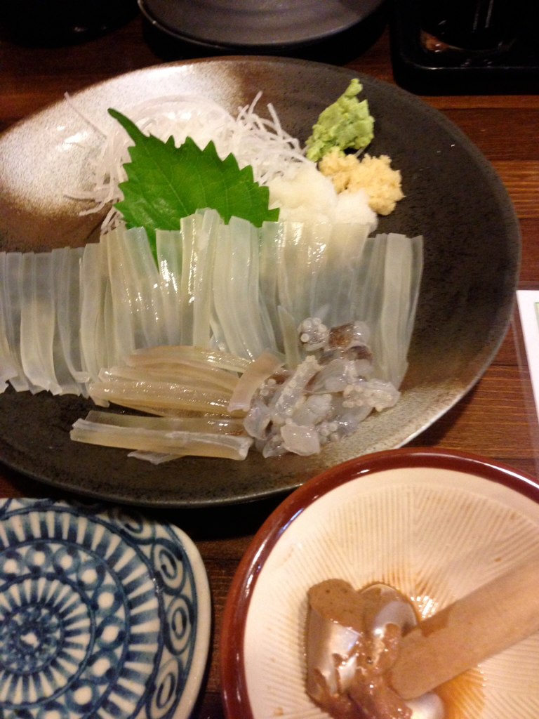 活イカ刺980円はお持ち帰りも可。すり鉢でキモを潰して醤油に混ぜる食べ方推奨だそうですが、私はキモをそのままでいただくのも生フォアグラ(?)っぽくて美味しいと思います。
