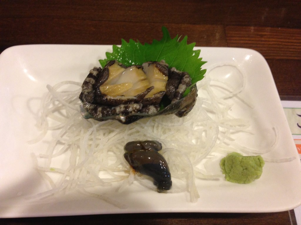 親指と人差し指で丸をつくった空間にすっぽり入るぐらいちっちゃなアワビの刺身(正)680円。