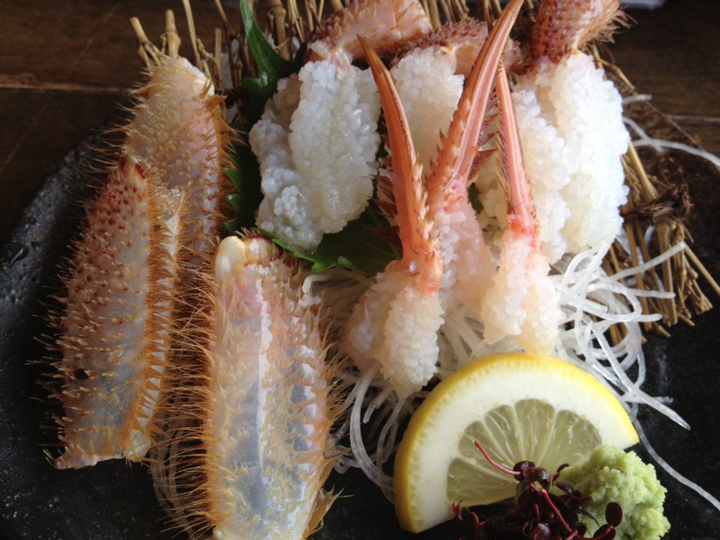 毛ガニ丸々はひとりで食べられないので、ちょこっとだけ刺身でいただきました。透き通った身が美しい…。