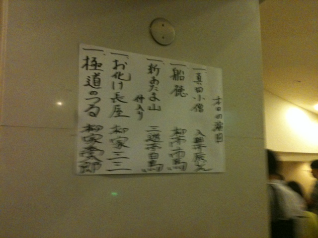 自分は桟敷席に空きがあったので潜り込んだ。隣のおっちゃんは落語歴何年だろうか、演者と演目をびっしり細かい文字で手帳に書き込んでいた。