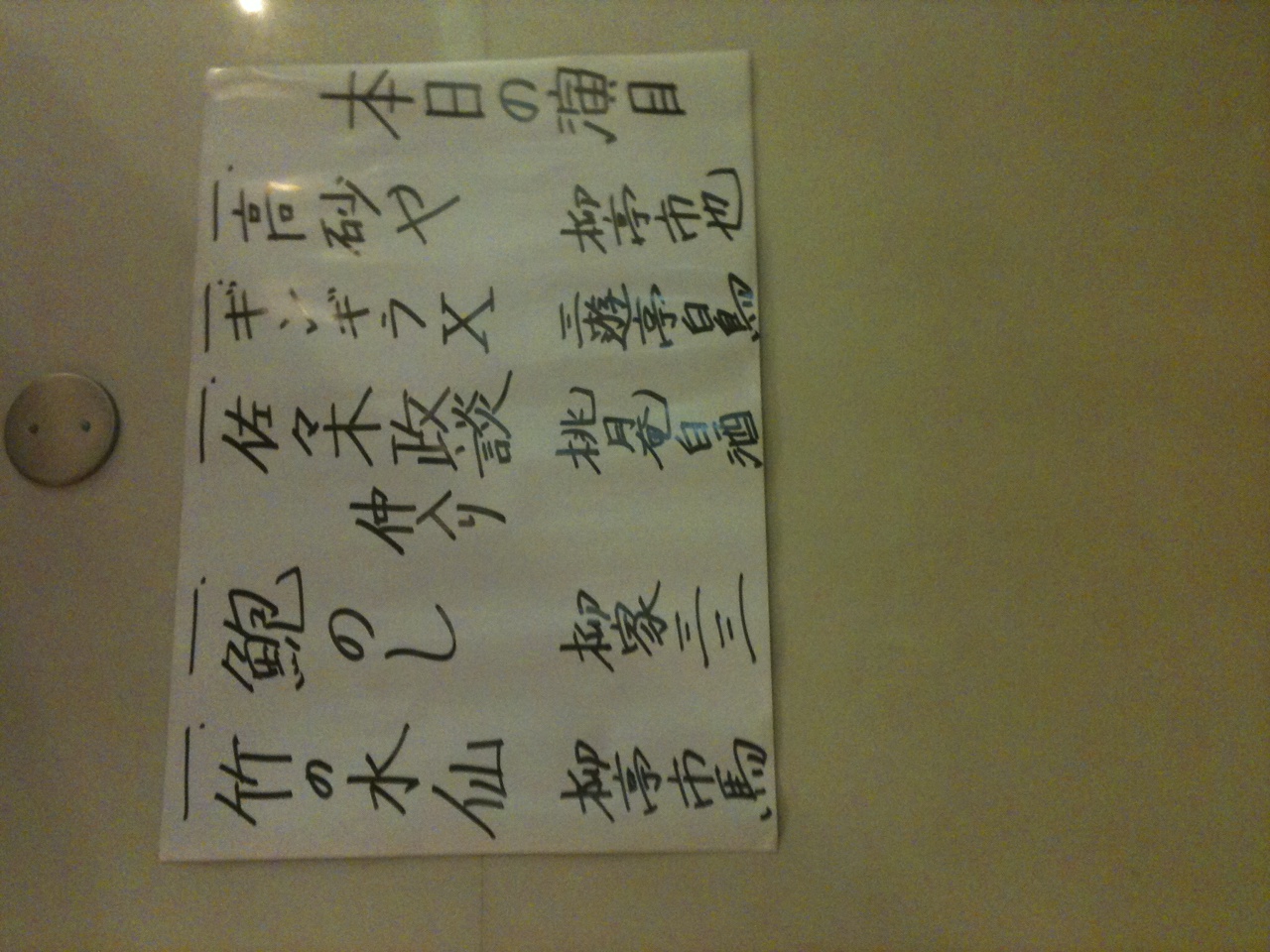 終演後に張り出されたネタ表は「ギンギラX」になってた。ネットで調べたら、「ピンピンマン」を「ギンギラX」に改題したらしい。「ピンピンマン」は落語のネタのコンクールで優秀賞になったアマチュアの作品を白鳥さんが噺にしたものだったと記憶している。バージョンアップして改題したのかな?